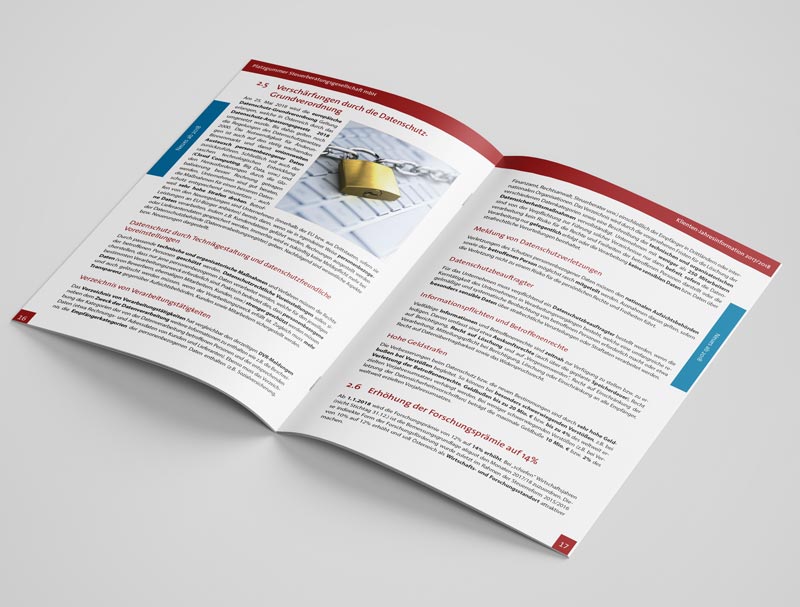 Die Klienten-Jahresinfo wird durchgängig vollfärbig gedruckt, A5 44 Seiten Bilderdruck.